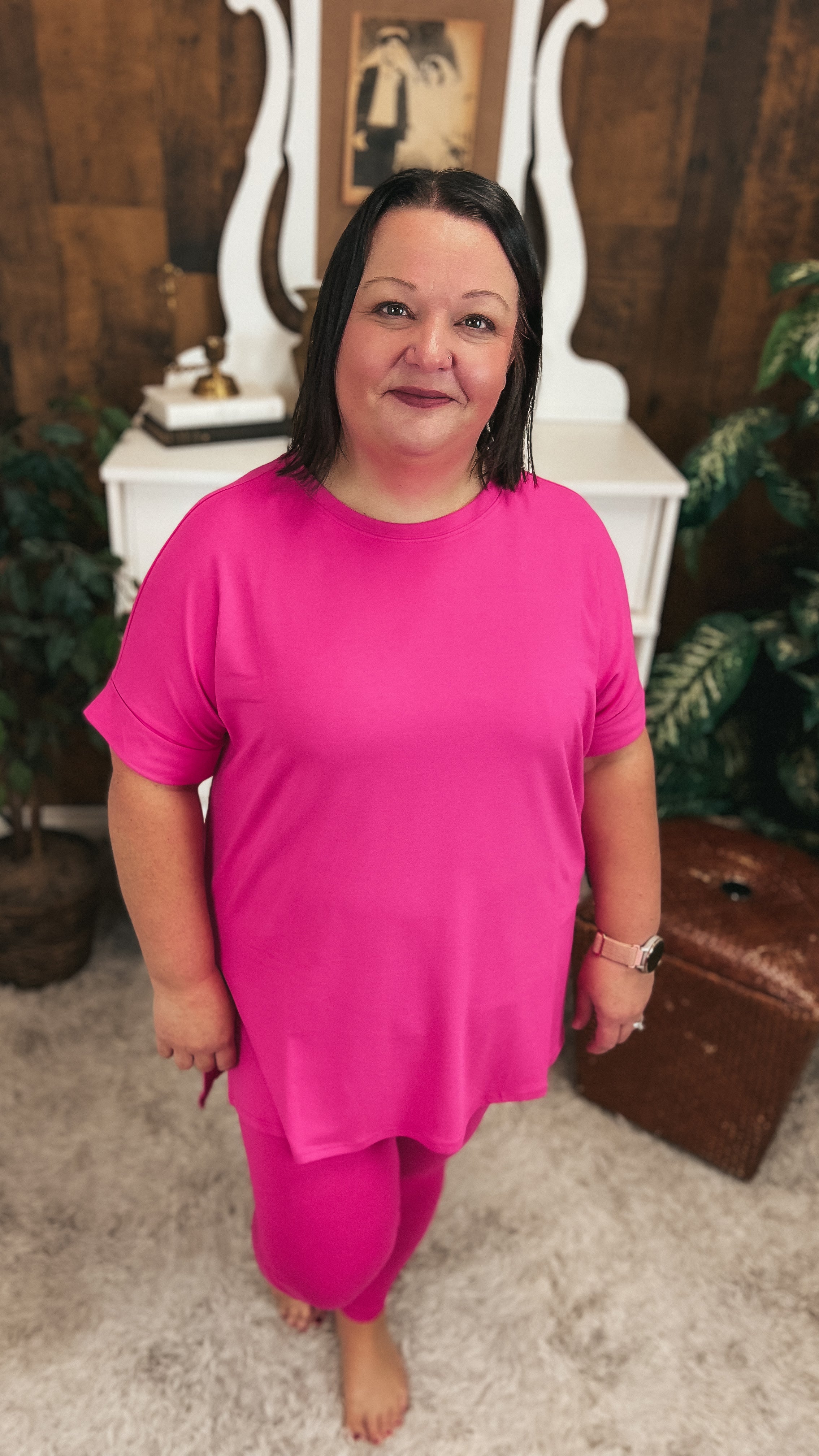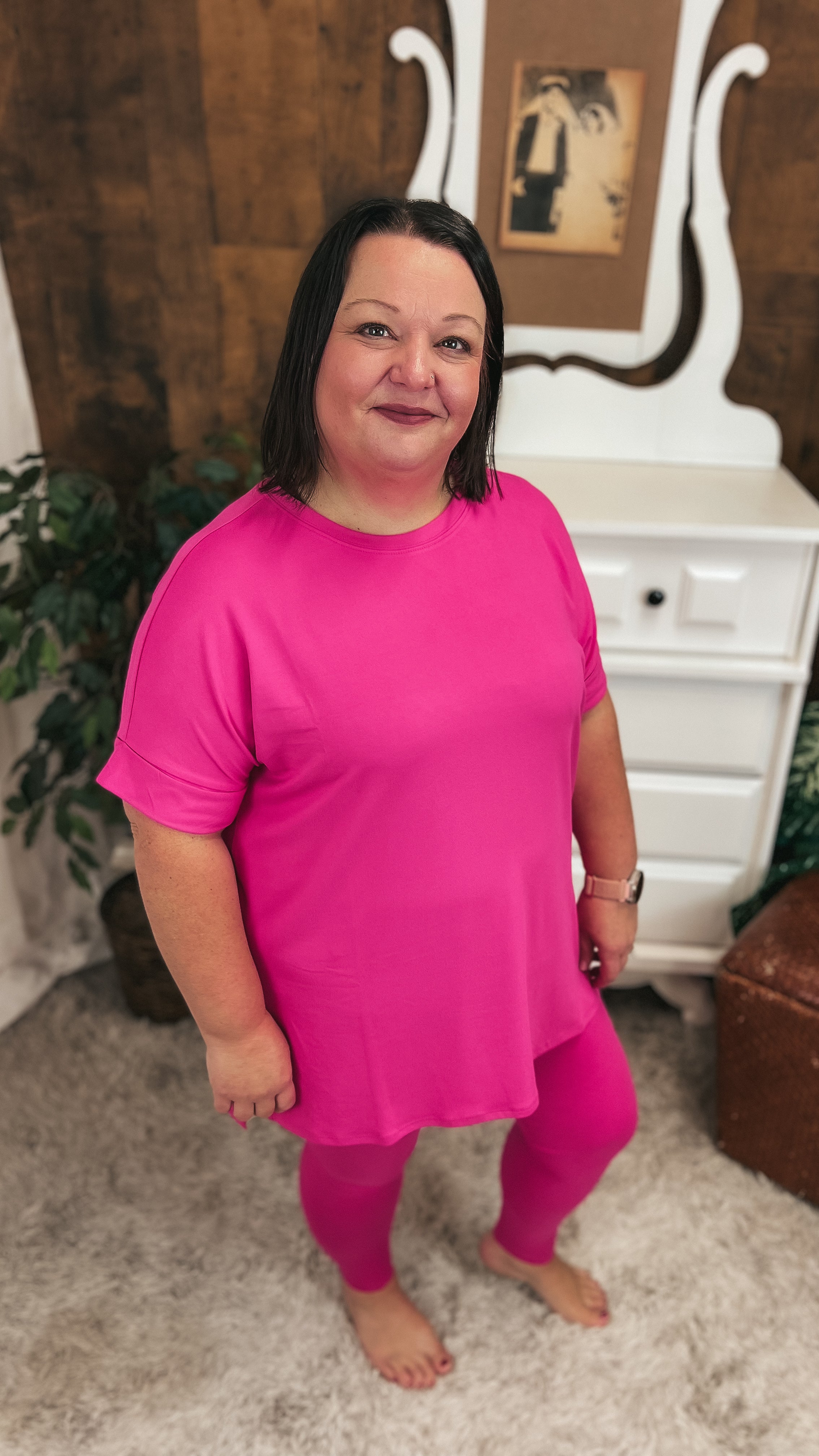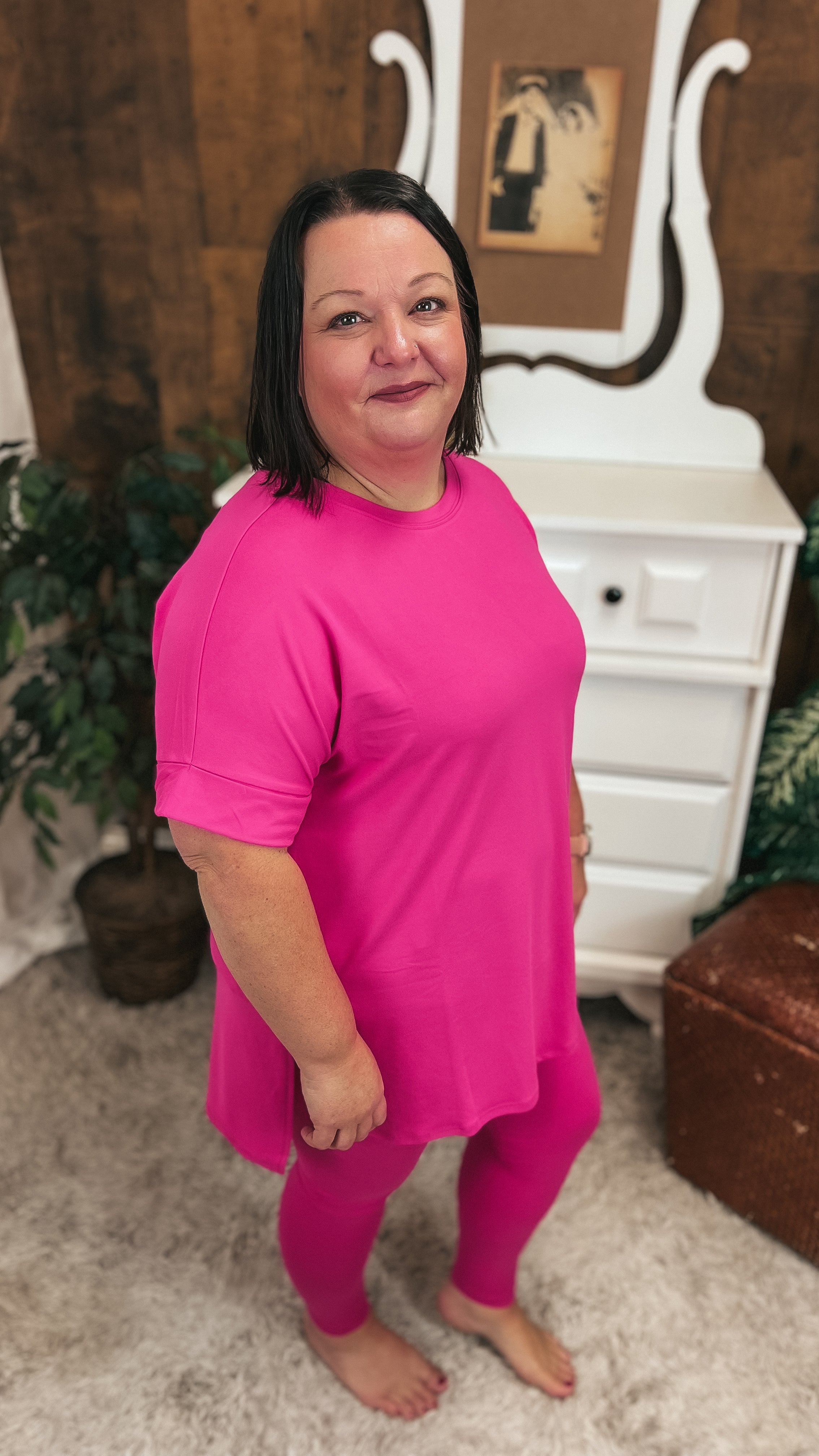 Introducing the Skylar Short Set 2.0 in hot pink - buttery soft brushed leggings and an oversized t-shirt combined for ultimate comfort and style. Feel cozy and chic in this versatile set perfect for lounging or running errands. (Trust us, you won't want to take it off!)
