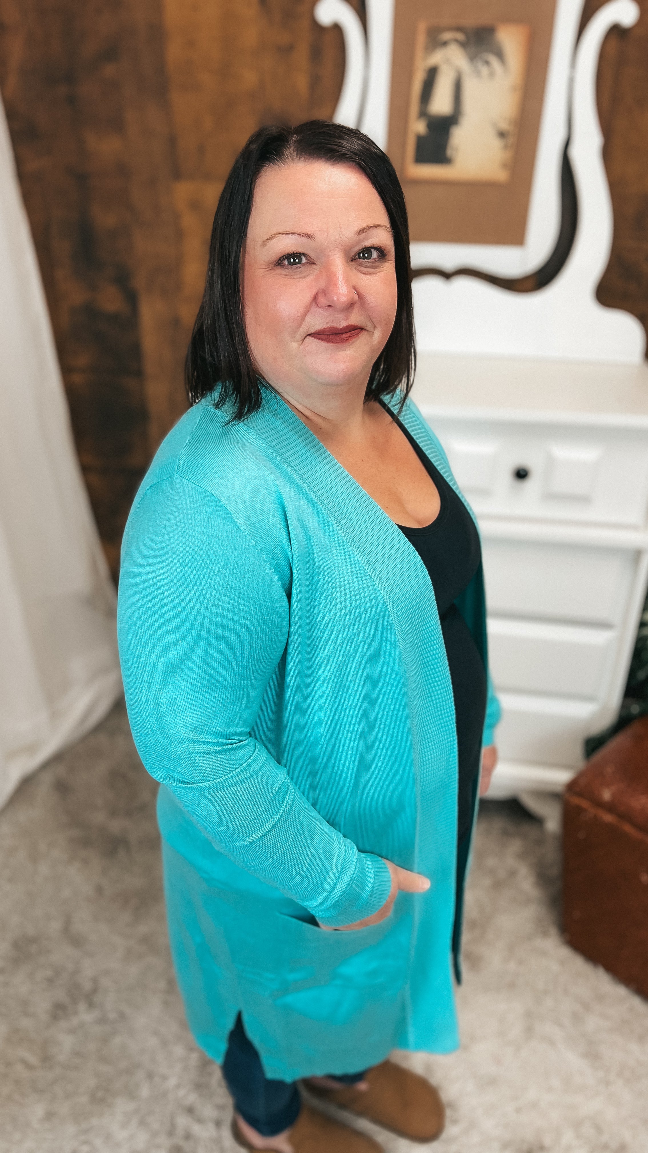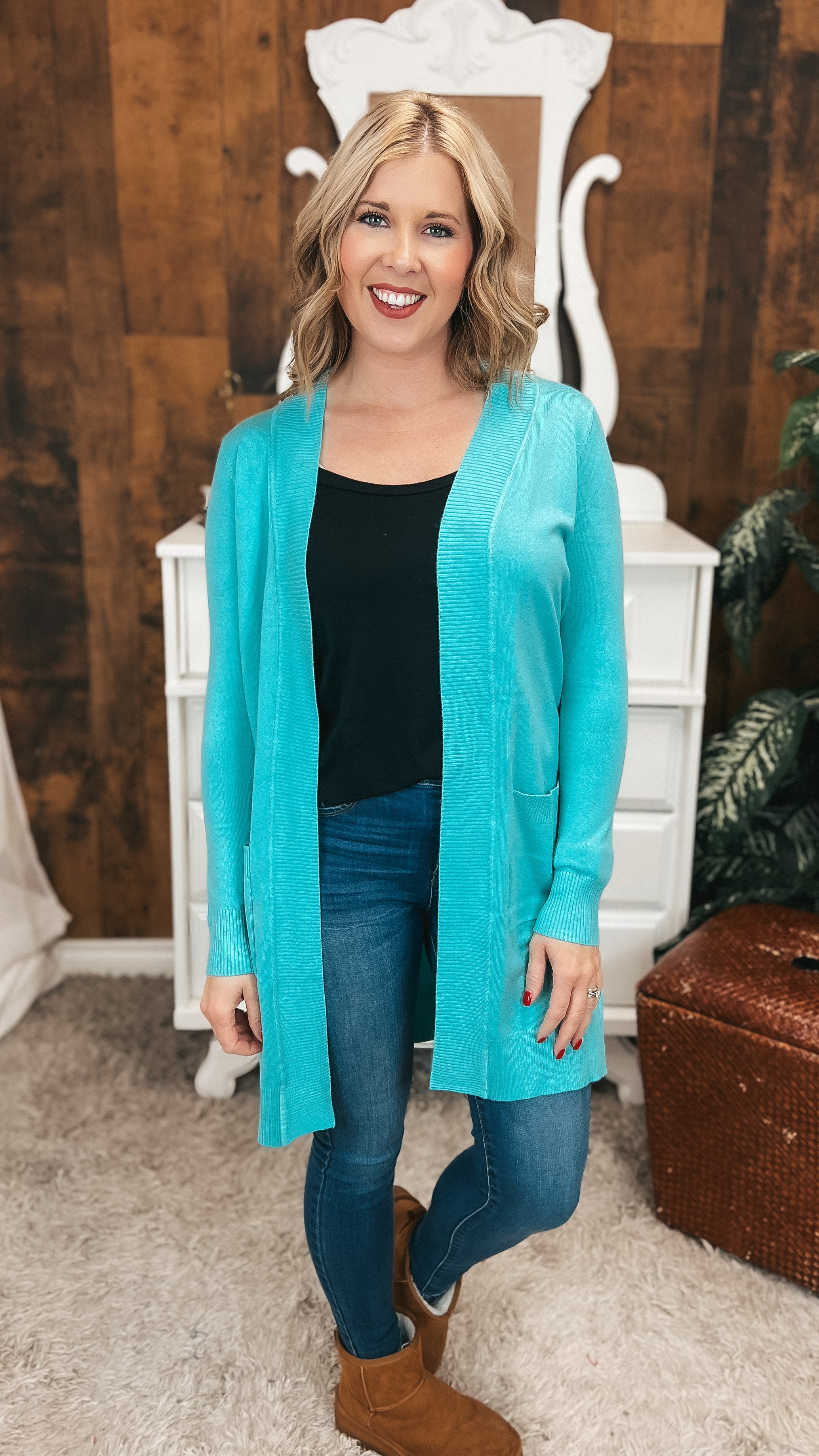 This soft knit cardigan offers cozy comfort with a classic ribbed trim detail, pockets and medium length. The true to size fit is great for pairing with every outfit and its gorgeous shape makes you look so put together without even trying. Win!