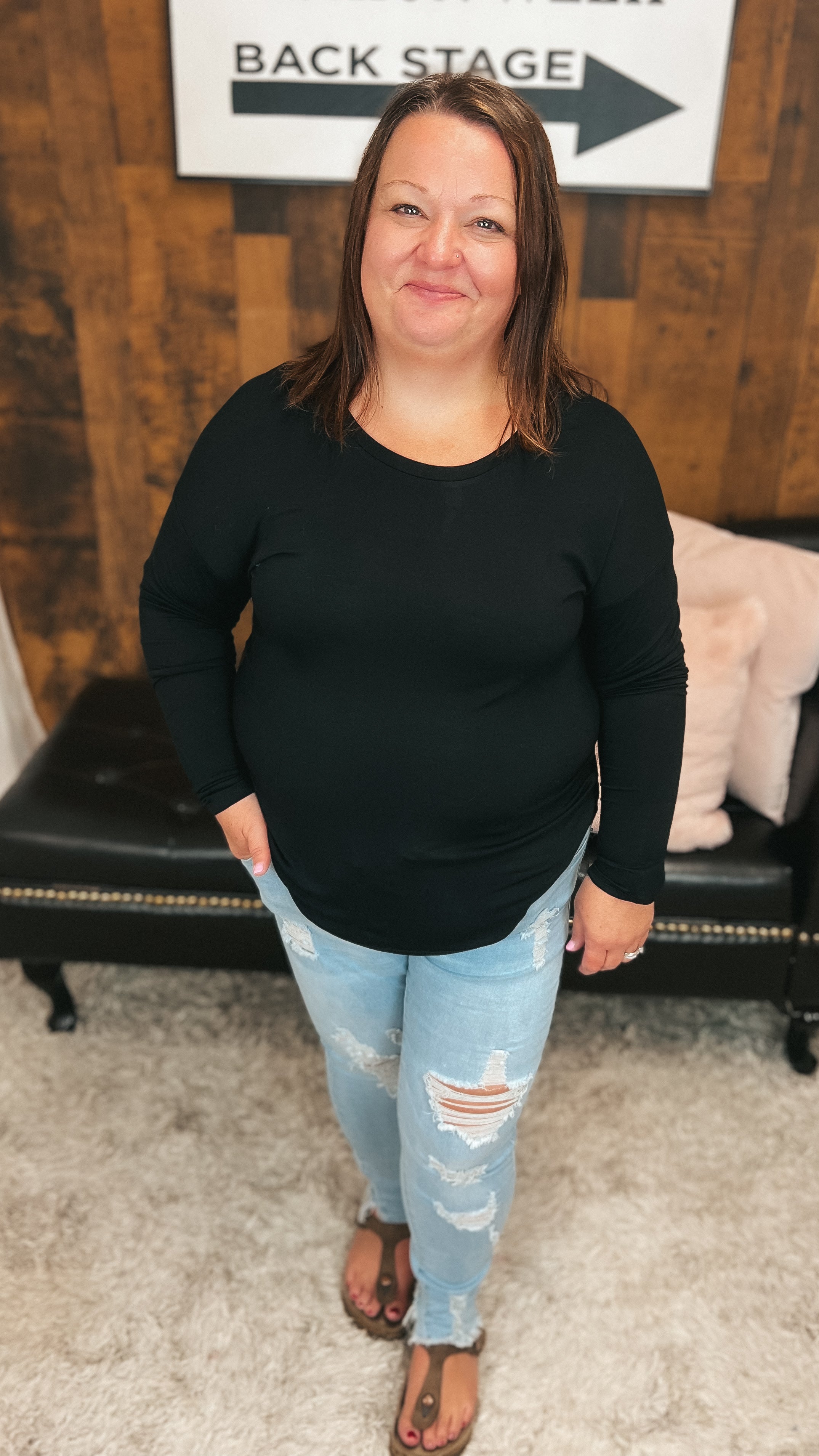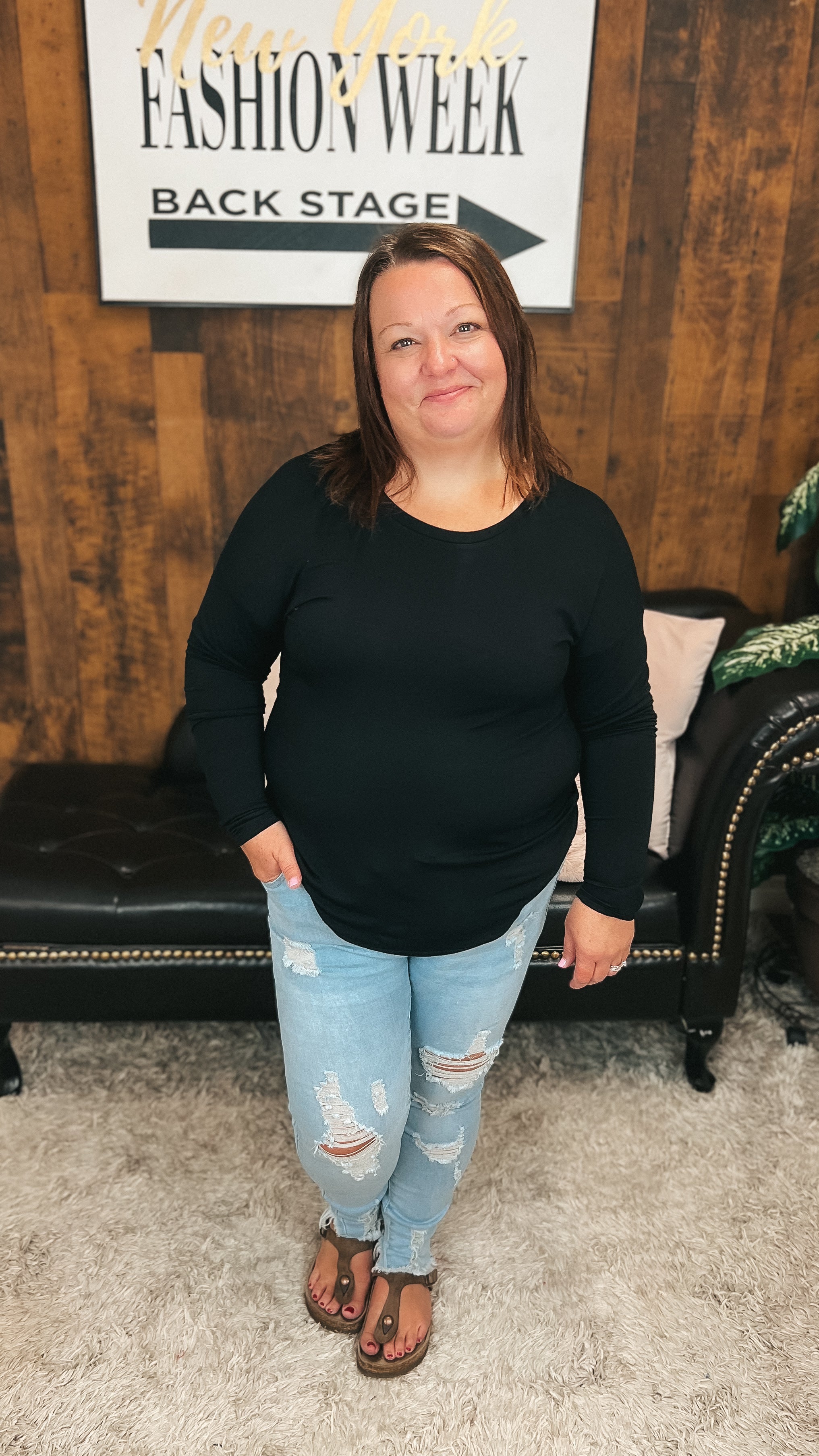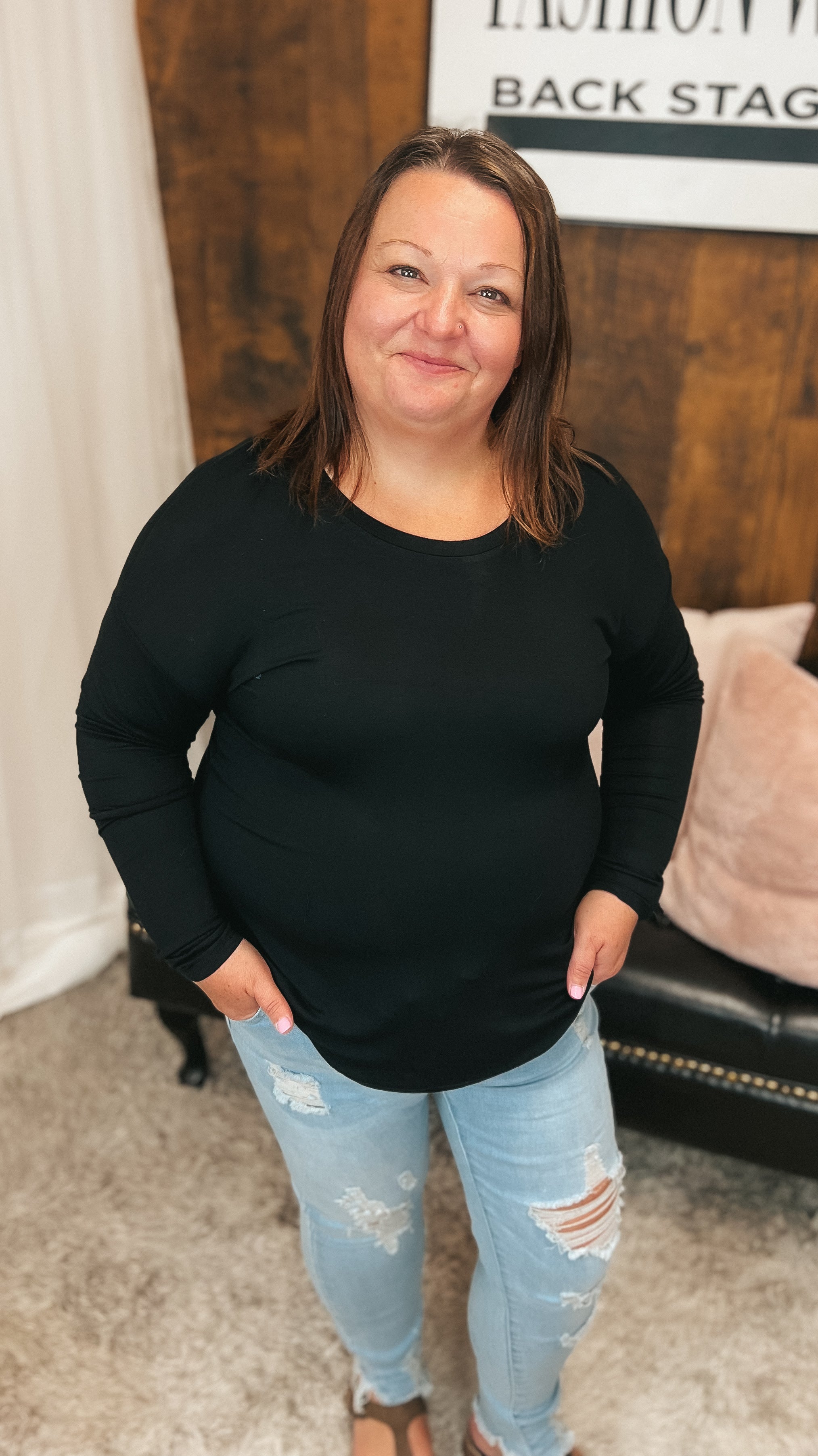 Meet your new favorite layering buddy! The Lauralee Long Sleeve in Black is back! Light as a feather with a thin, breathable fabric and a scooped hem that adds just the right touch of flair. Perfect for stacking under your jackets or rocking solo on breezy days, this essential long sleeve keeps you comfy and effortlessly stylish all day long. Grab yours before it disappears again!